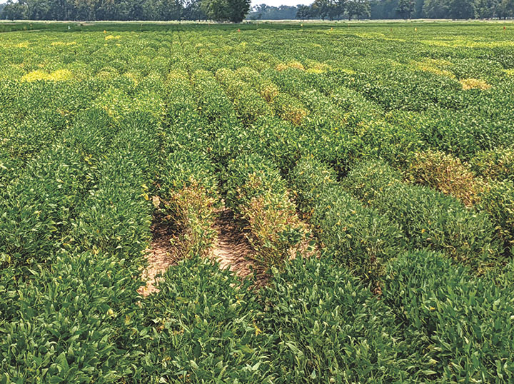 Figure 1. Two-row soybean variety plots not treated with a fungicide showing various levels of severity from charcoal rot.