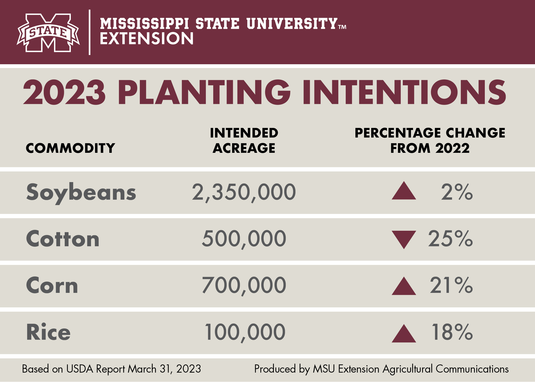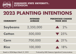 “Weather will be the primary factor in any change in planting intentions for Mississippi producers. At this time of year, most producers have already locked in seed for the season, so they are less flexible to make planting changes based on market conditions,” Maples said. “The market will be using the planting intentions report as a benchmark, and then any weather events or perceived planting delays will drive market direction until we get the June acreage report on how much was actually planted.”