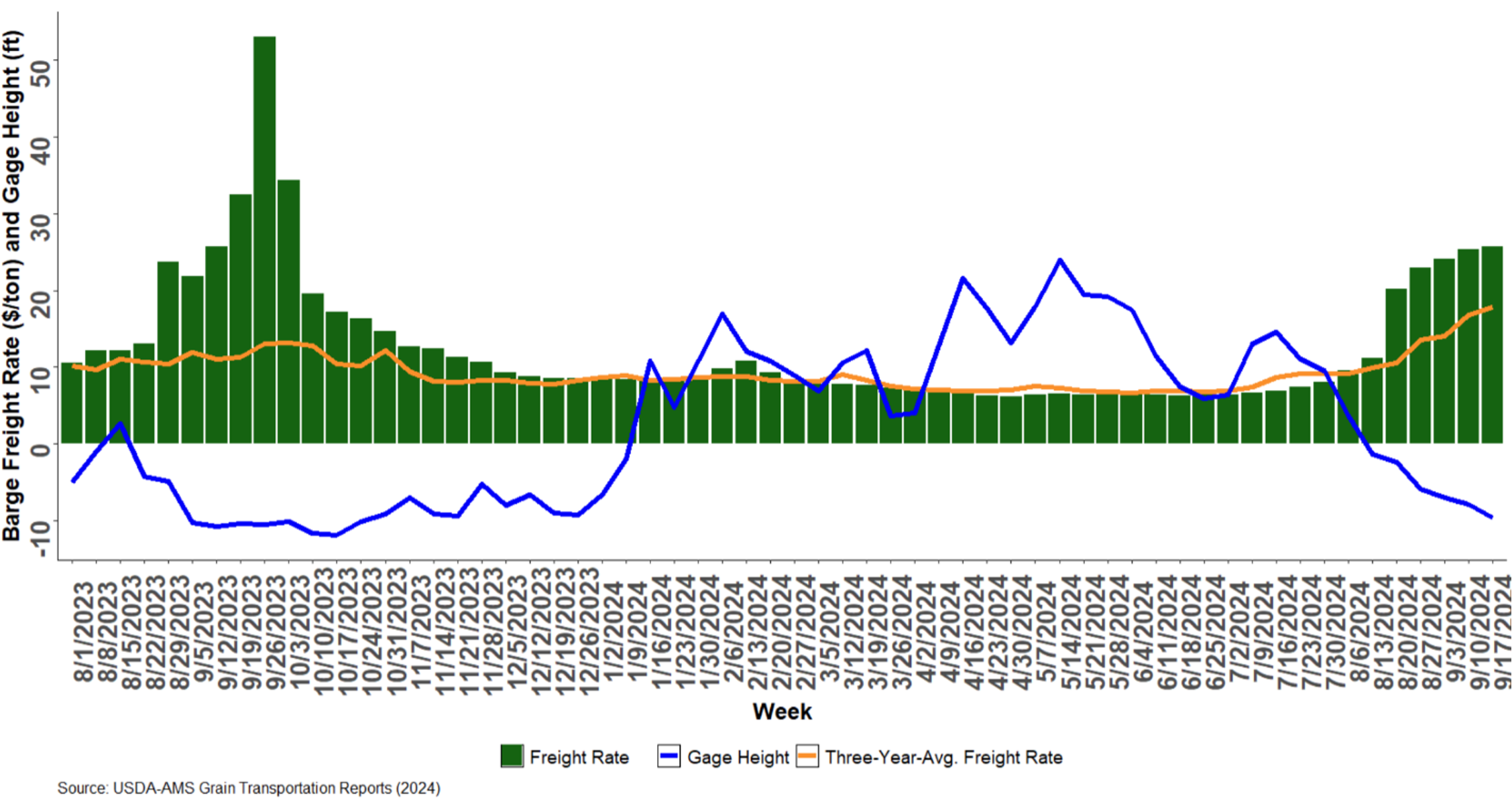 Figure 1 plots the Mississippi River level measured at Memphis, Tennessee, for the period Aug. 1, 2023, through Sept. 3, 2024. This figure also provides the weekly average freight, as well as the expected barge freight rate measured by the non-drought three-year average freight rate (i.e., 2019-2021). As the gage height falls, barge freight rates increase, and vice versa.