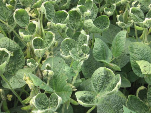 Injured soybeans exhibit typical “cupping” symptoms as well as blistering and pickering.